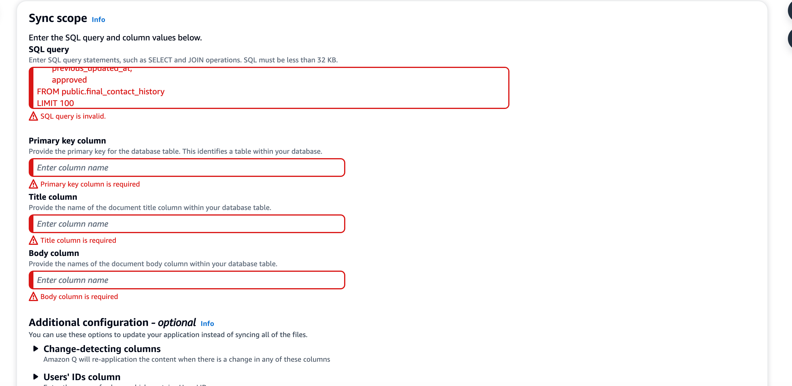 6. While setting up a data source, you can define various items like authentication (in secrets manager) and custom metadata based on the type of retriever that’s developed. There's also an interesting "Web Crawler" data source - which can crawl specific websites and URLs for information. I was able to also create this custom web crawler in Q by specifying some URLs. Q does a good job in indexing a bunch of documents it finds in those URLs - especially great if you're looking to develop use cases around competitive intelligence for example