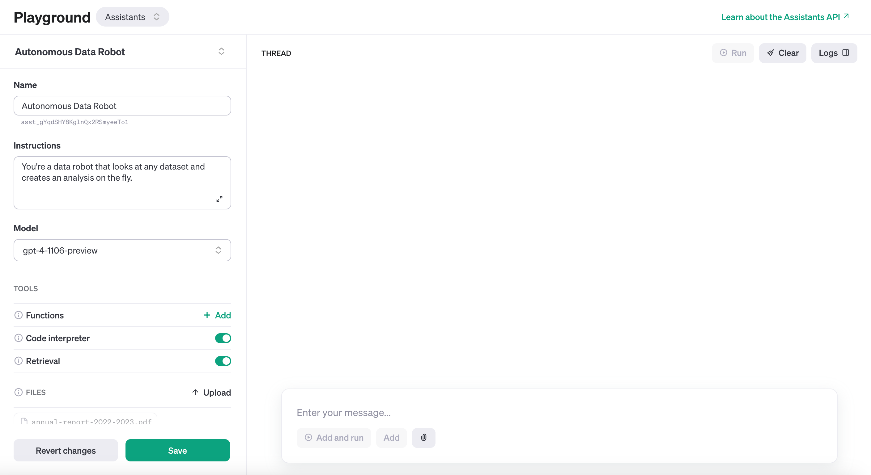 This is the other brilliant release - in our AI applications we often have to build in sub modules or “sub agents” to handle particular tasks. Now the Assistants API provides us a way to easily access the code interpreter, add knowledge base references (previously done through embeddings in vector databases) and in the near future have other capabilities such as web browsing and image generation. For example, we’ve had to build specific functions to handle large data outputs in our previous cycles of application development. Now with code interpreter available “online” during an API call, we can take away this development overhead and focus on developing better business logic. We can develop smart agents within an application in perhaps 2-3x faster time than before. There's a playground for us to start developing "agents" for our applications immediately.